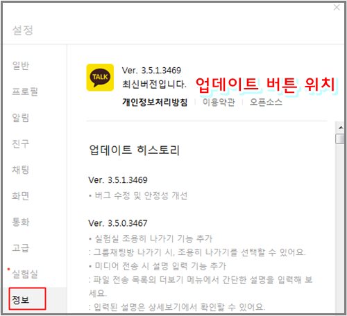 - 혹은 카카오톡 > '설정' > '정보'로 들어갈 수도 있습니다.